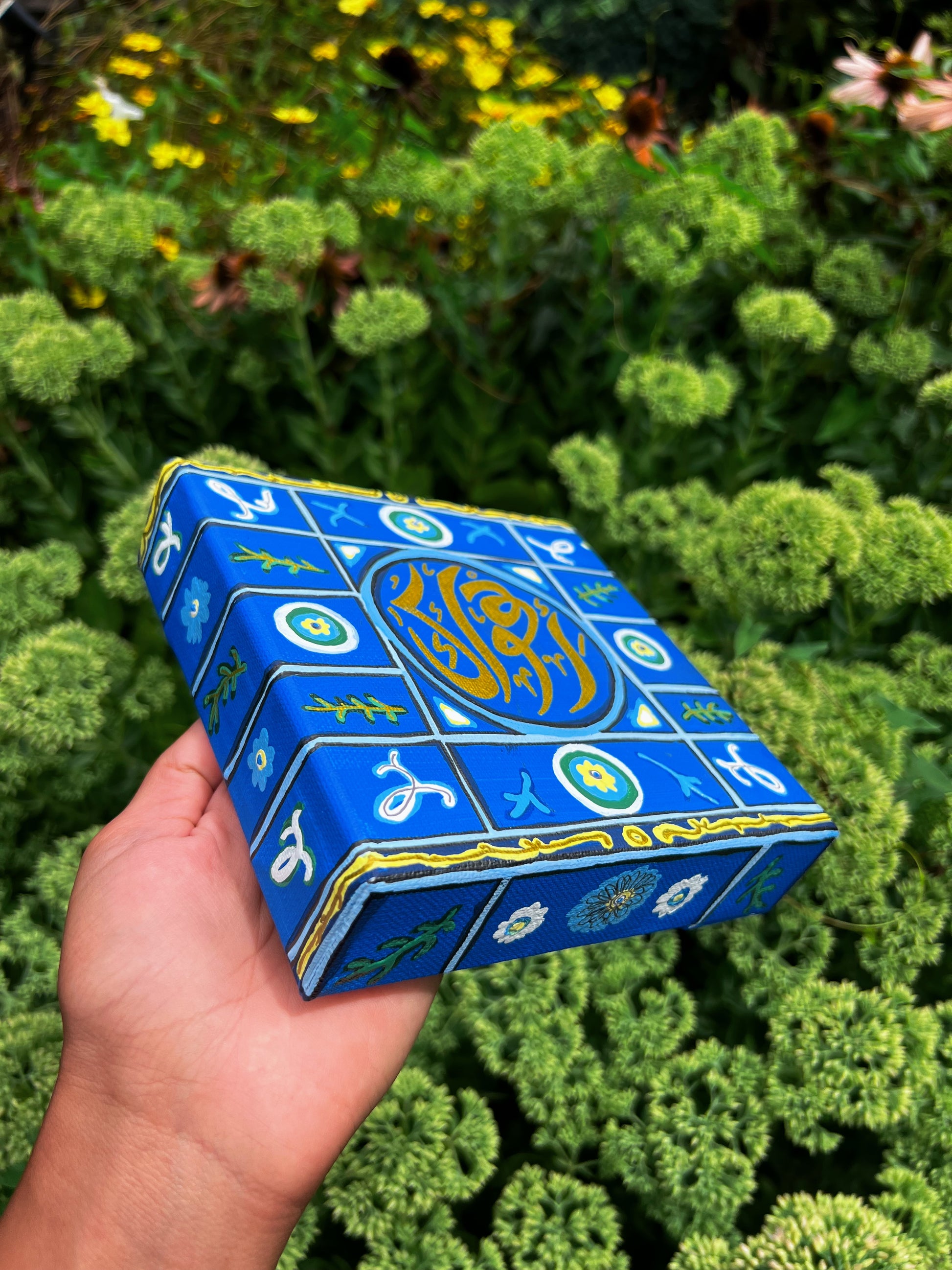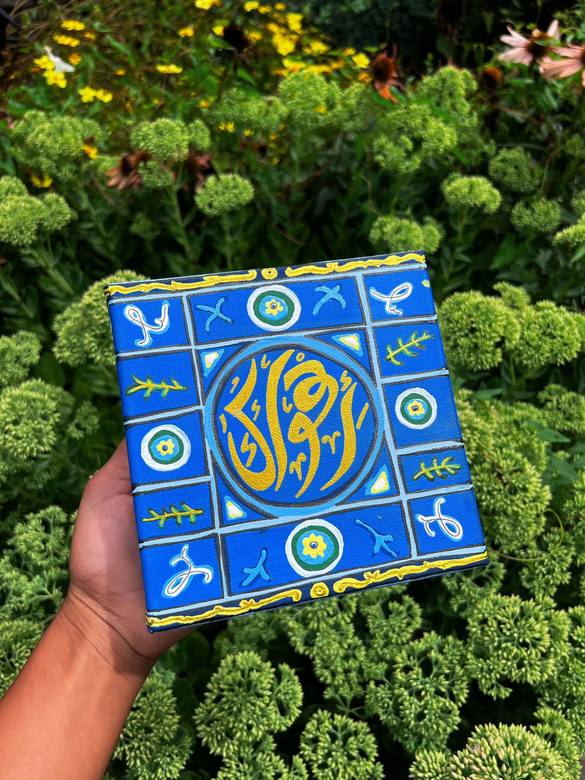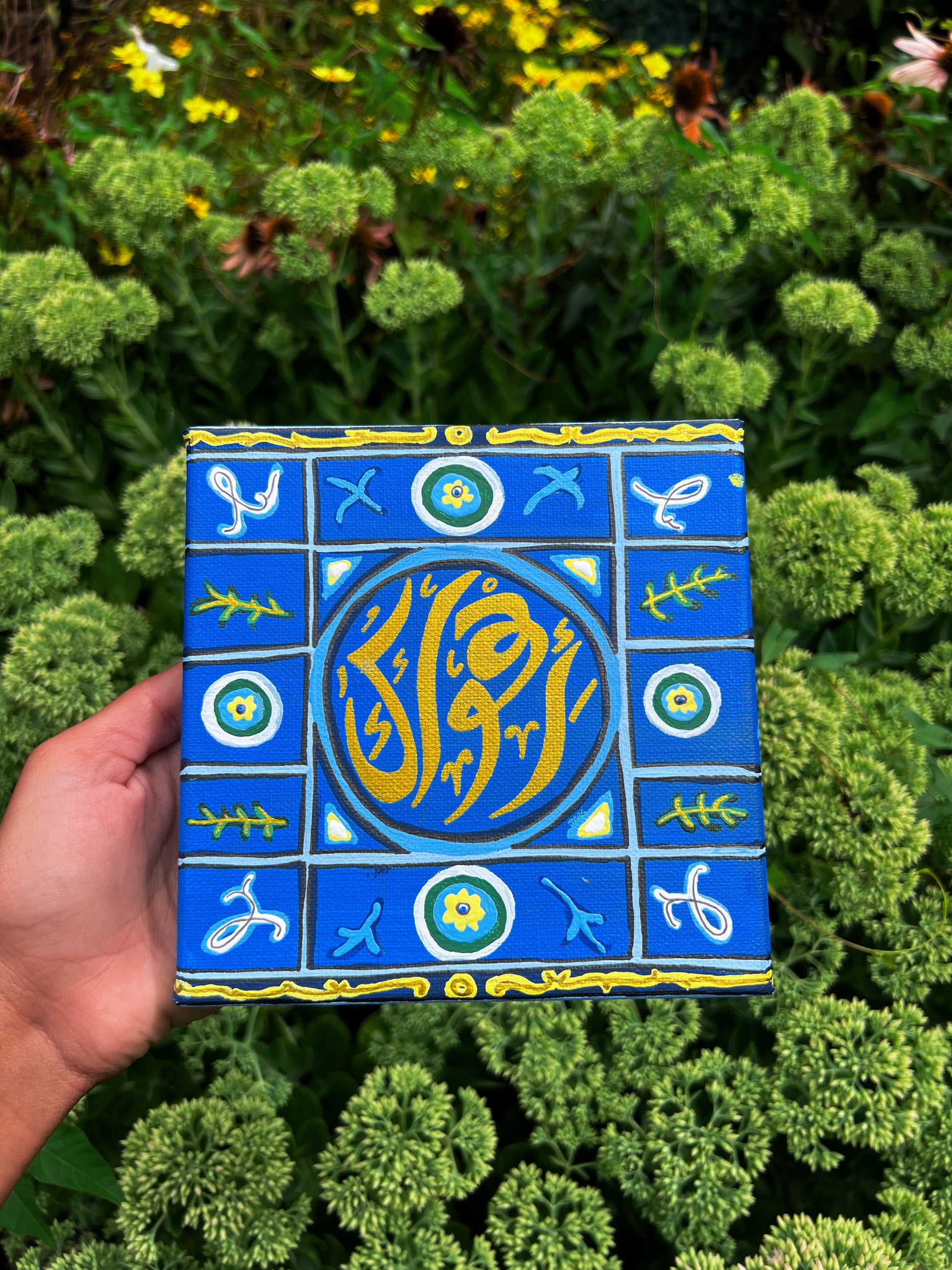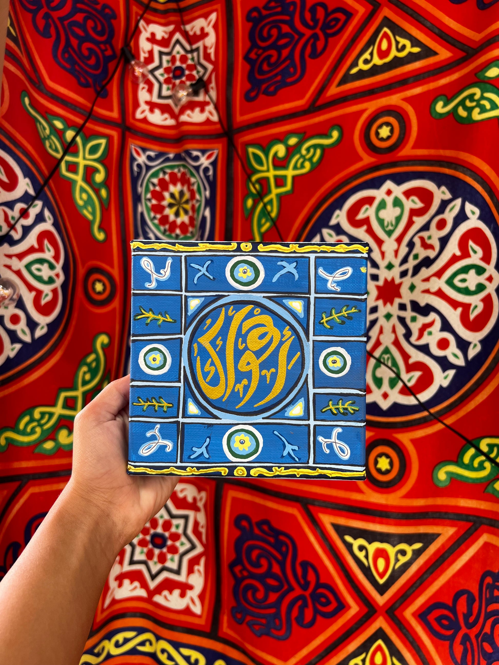 #2 :Pointinkk Khayamiya Series on a 6x6 chunky canvas— Ahwak (أهواك, “I love you”), inspired by the timeless voice of Abdelhalim Hafez. Originally hand painted in Arabic calligraphy and framed with a vibrant blue khayamiya pattern💙