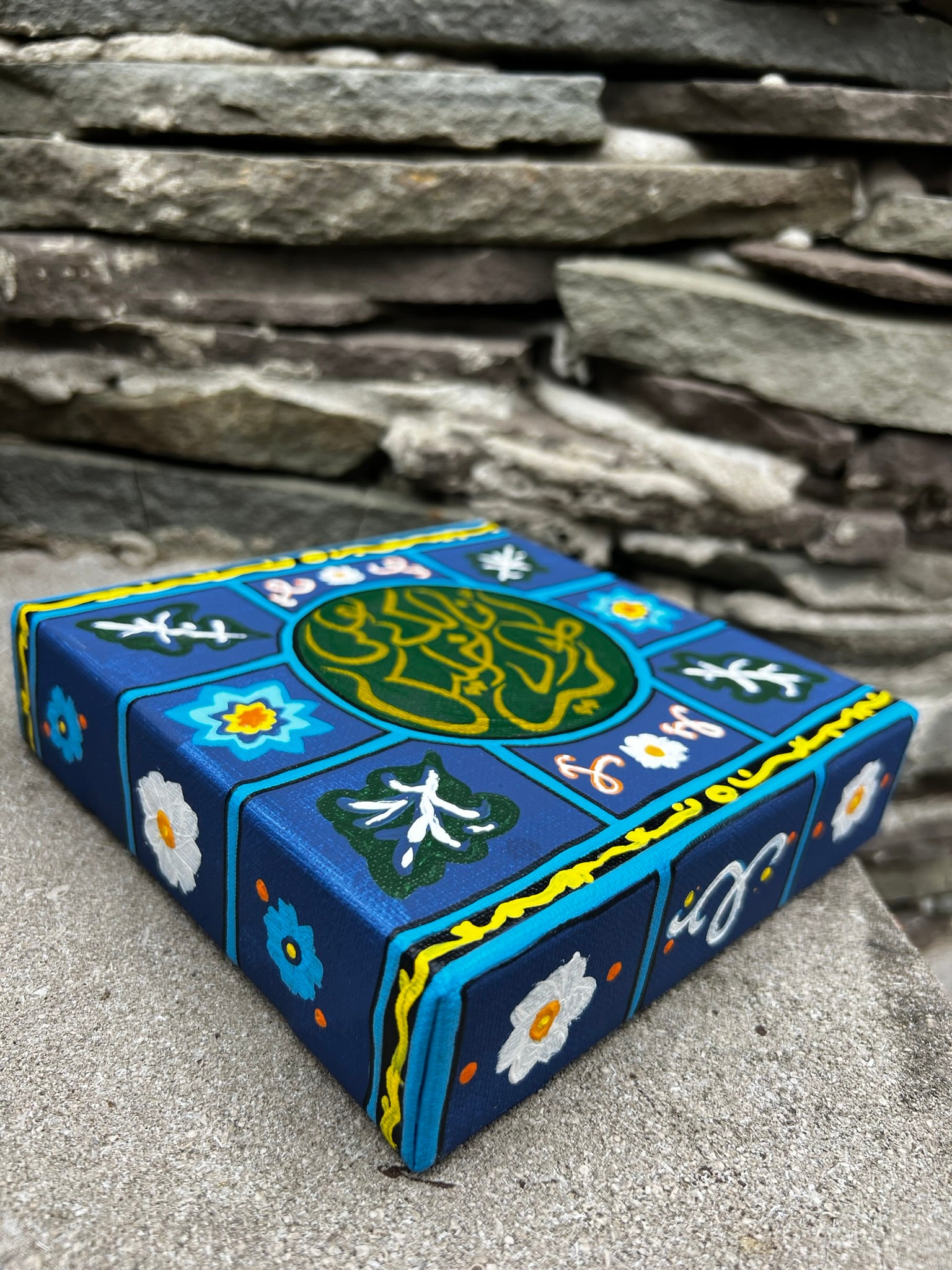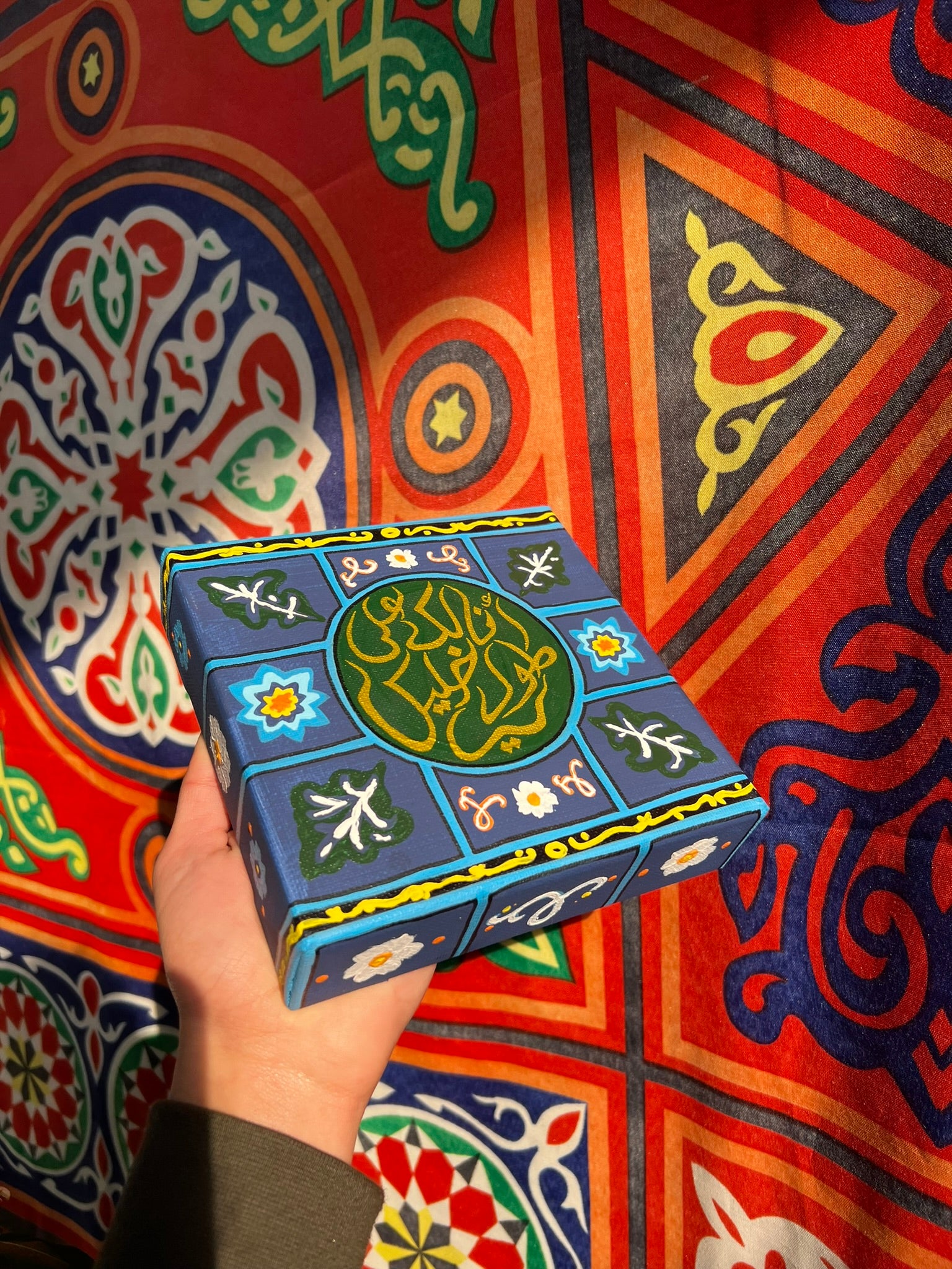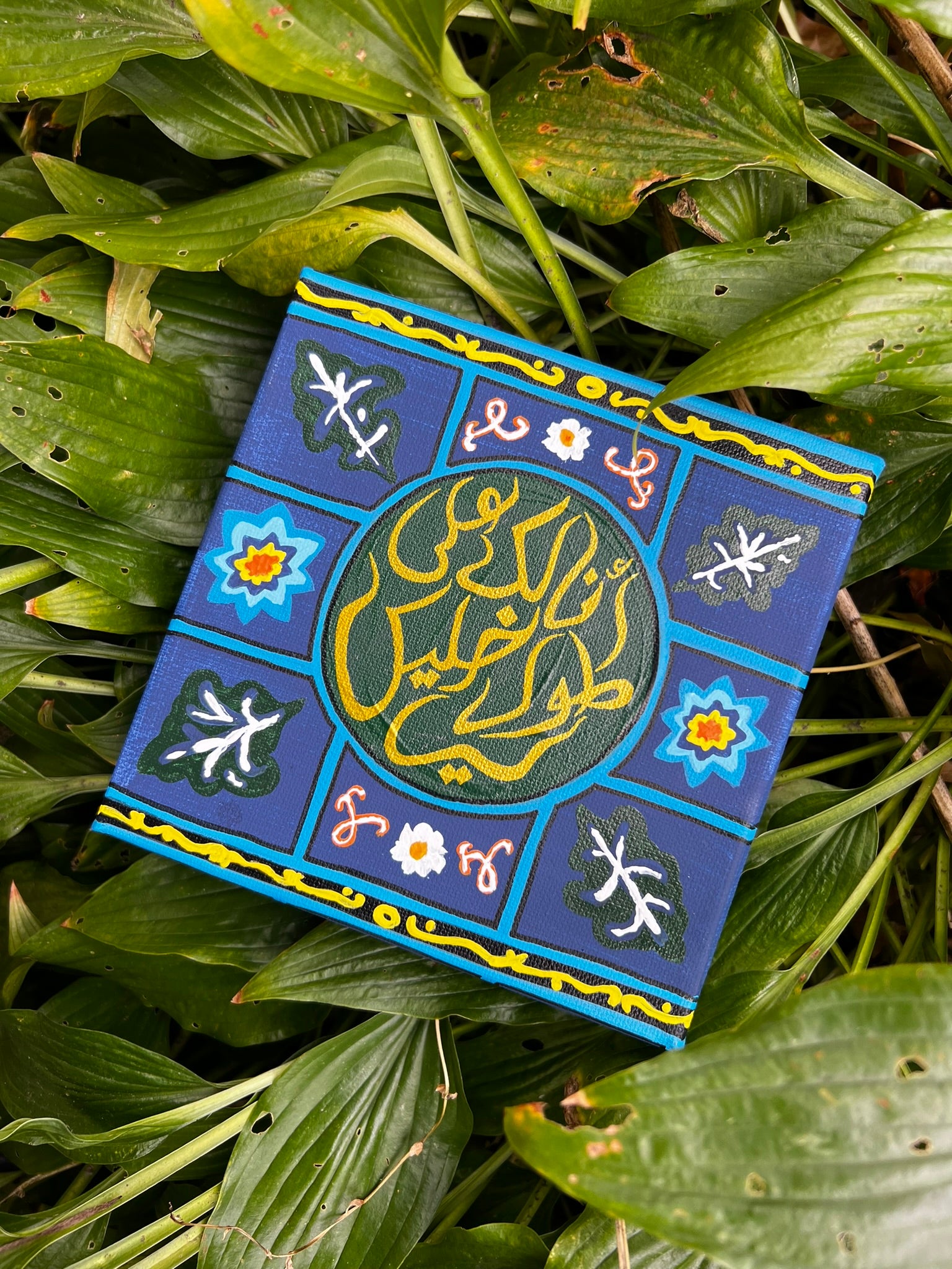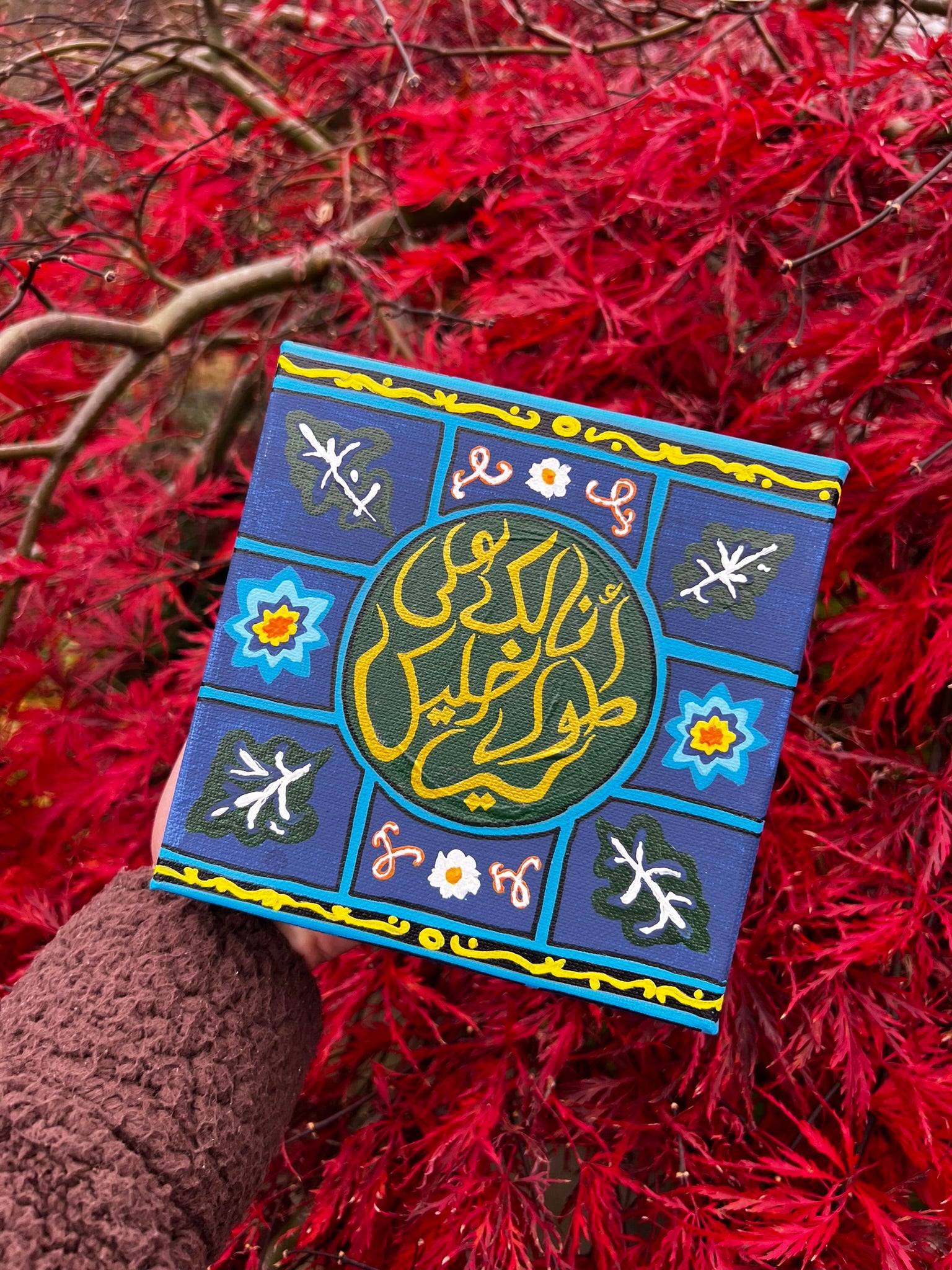 #8: Pointinkk Khayamiya Series on a 6x6 chunky canvas — Ana Lak Ala Toul (أنا لك على طول, “I’m yours forever”), inspired by the legendary voice of Abdel Halim Hafiz. Originally hand painted in elegant Arabic calligraphy and wrapped in a bold blue khayamiya pattern that gives it that rich, timeless aesthetic. 💙