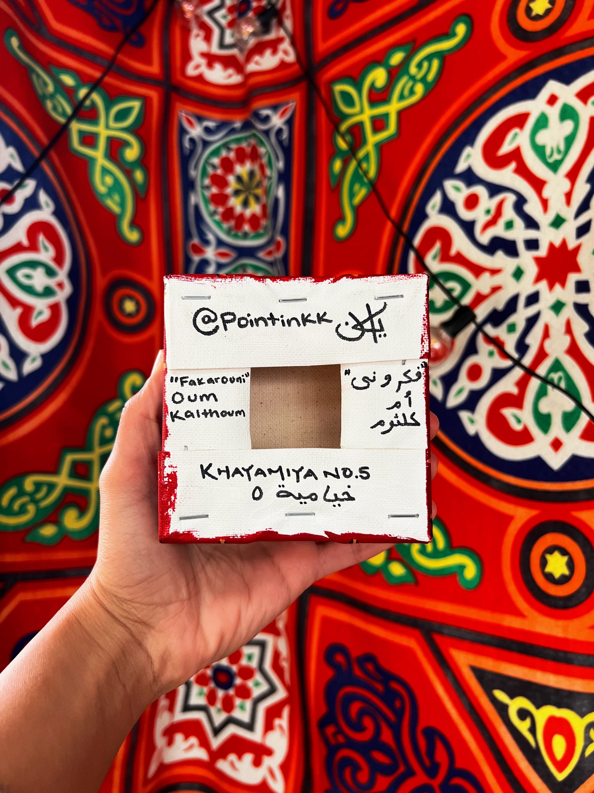 #5: Pointinkk Khayamiya Series— Fakarouni (فكروني, “They Reminded Me”), inspired by the legendary Umm Kulthum. Painted in Arabic calligraphy and framed with the vibrant patterns of Egyptian Khayamiya.